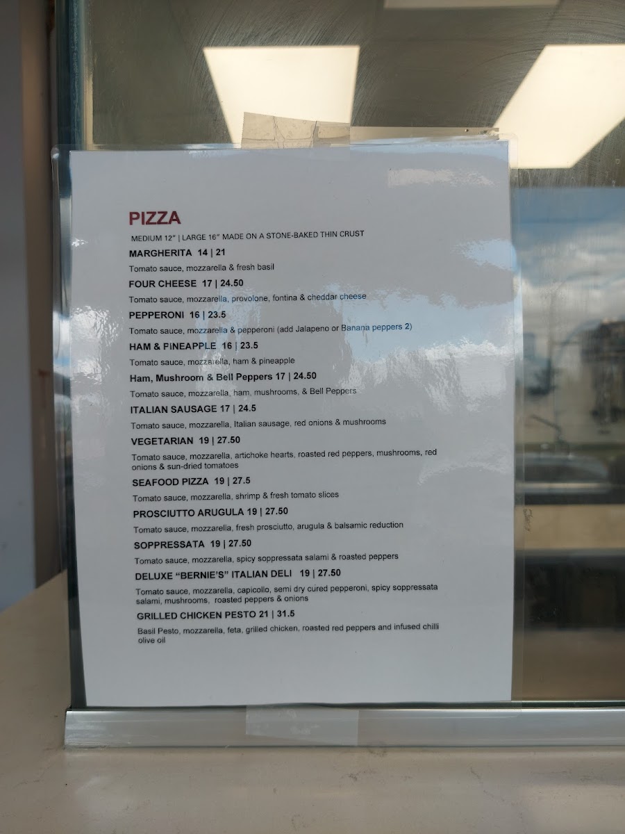 The menu offers a variety of Italian deli and restaurant items, including sandwiches, pasta dishes, soups, and stone oven pizzas. It is structured to provide options for light meals, casual dining, and take-home orders, suitable for lunch or dinner.
